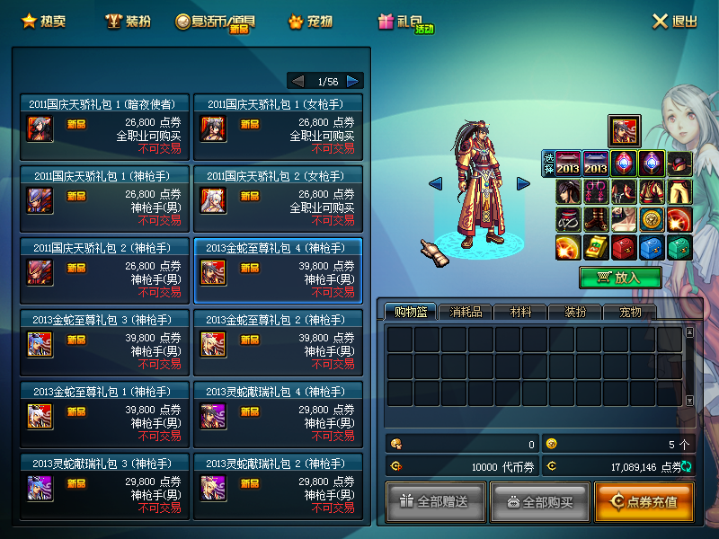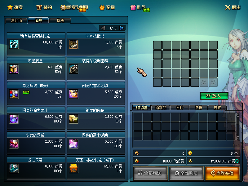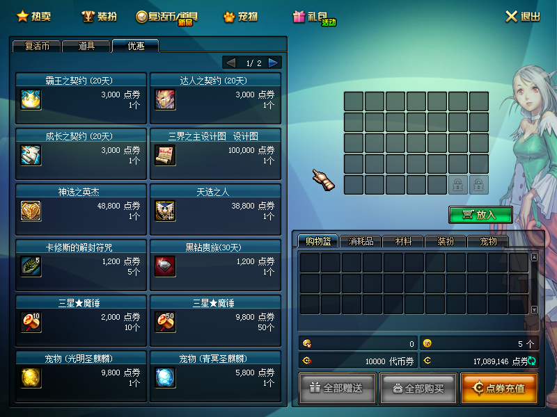 新手上线赠送代币券可在商城购买礼包,代币券每分钟赠送一次周末活动时五倍加成,→图表 1【限时抢购】道具需用点券购买,获取方式为每使用一条CDK赠送100点券一个消费证明