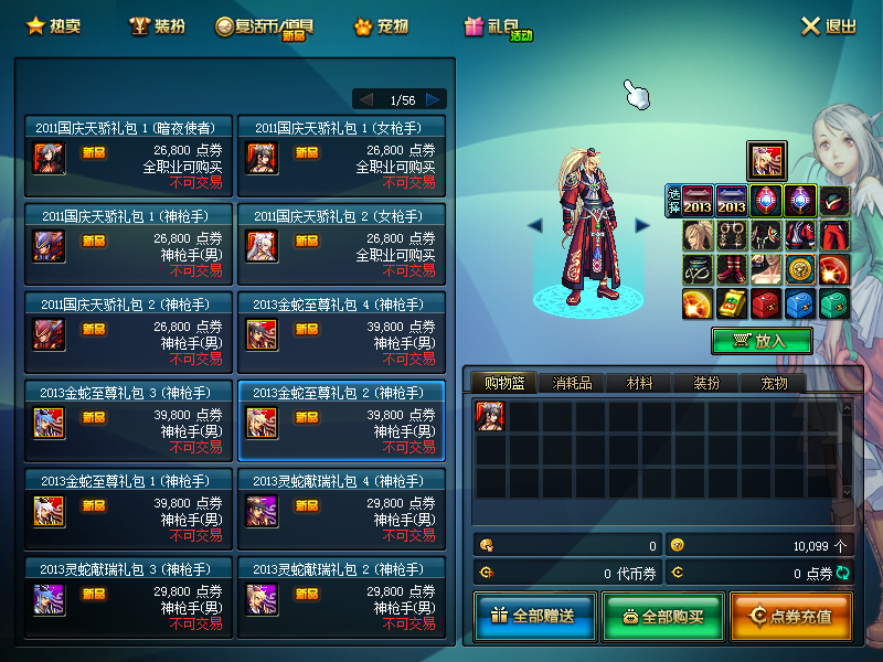 新手称号一个、侍魂武器一把、稀有克隆一套、新手礼包(三契约、复活币、各种药水)、55CC套自选、满级胶囊、新手宠物小婴儿