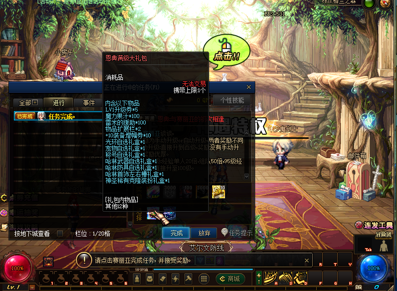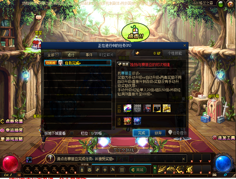 2.从1级开始做任务玩上去:赛利亚直接领取第二个升级新手礼包,做完瞬间移动以后就可以正式进入主线任务剧情,1级从洛兰开始,洛兰地图集成到了格兰之森大地图,埃尔文防线一直往左边,任务细节请看任务图文提示教程!!!