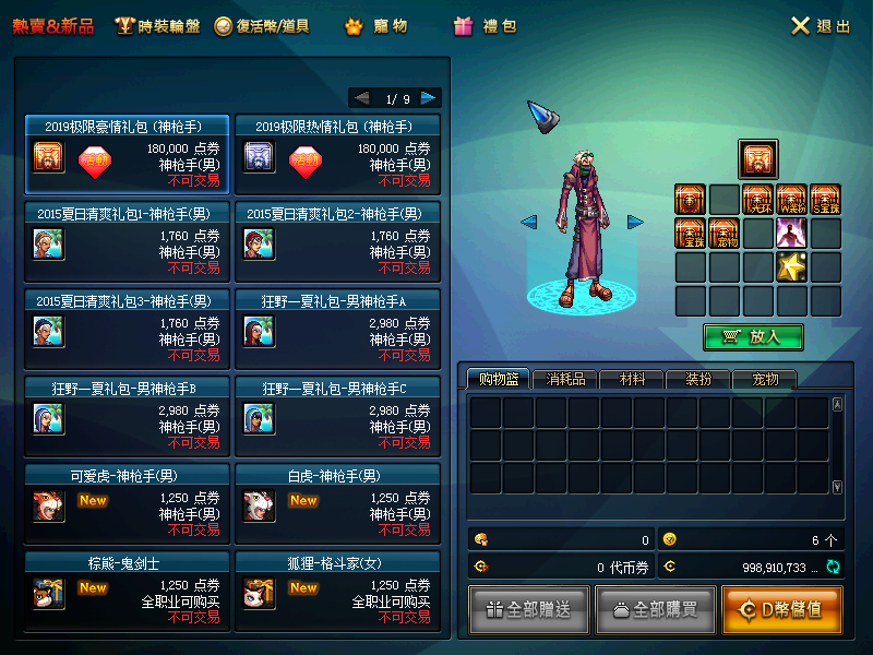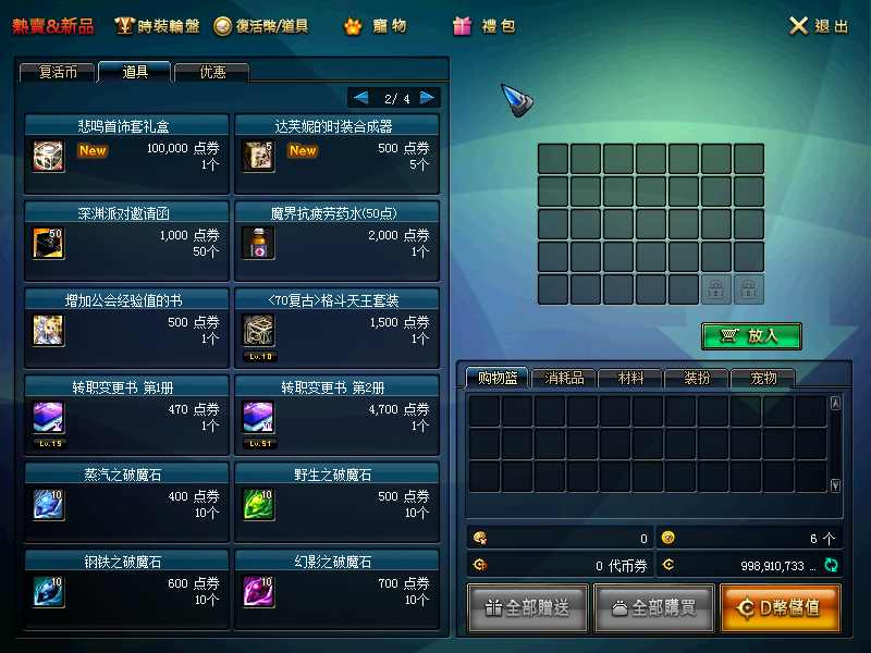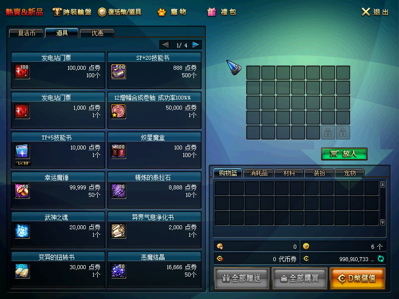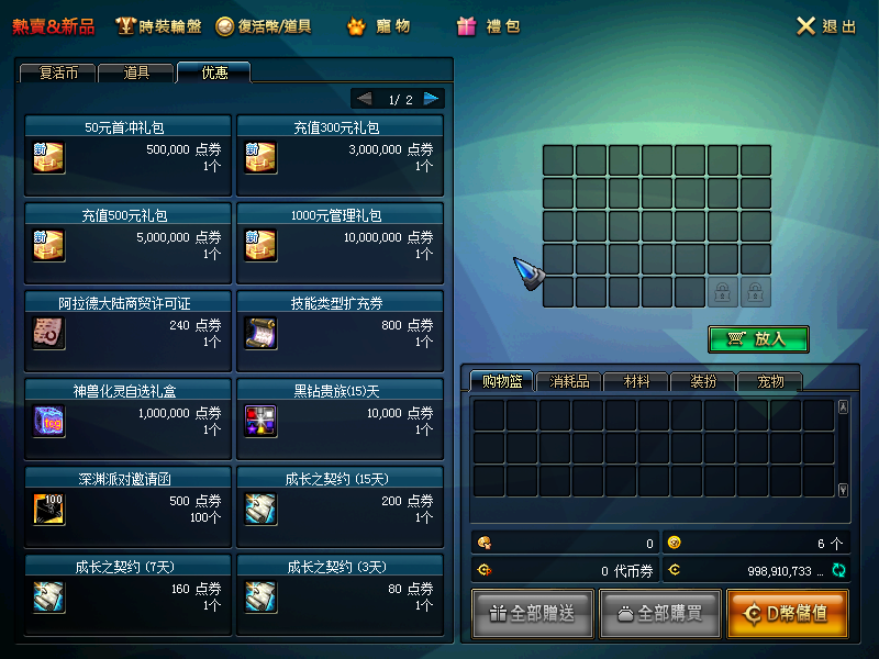 2.送的30W点券,先去商城买必备契约和黑砖(不要买礼包)点券留着后面有用,大饼买商店,钱也留着